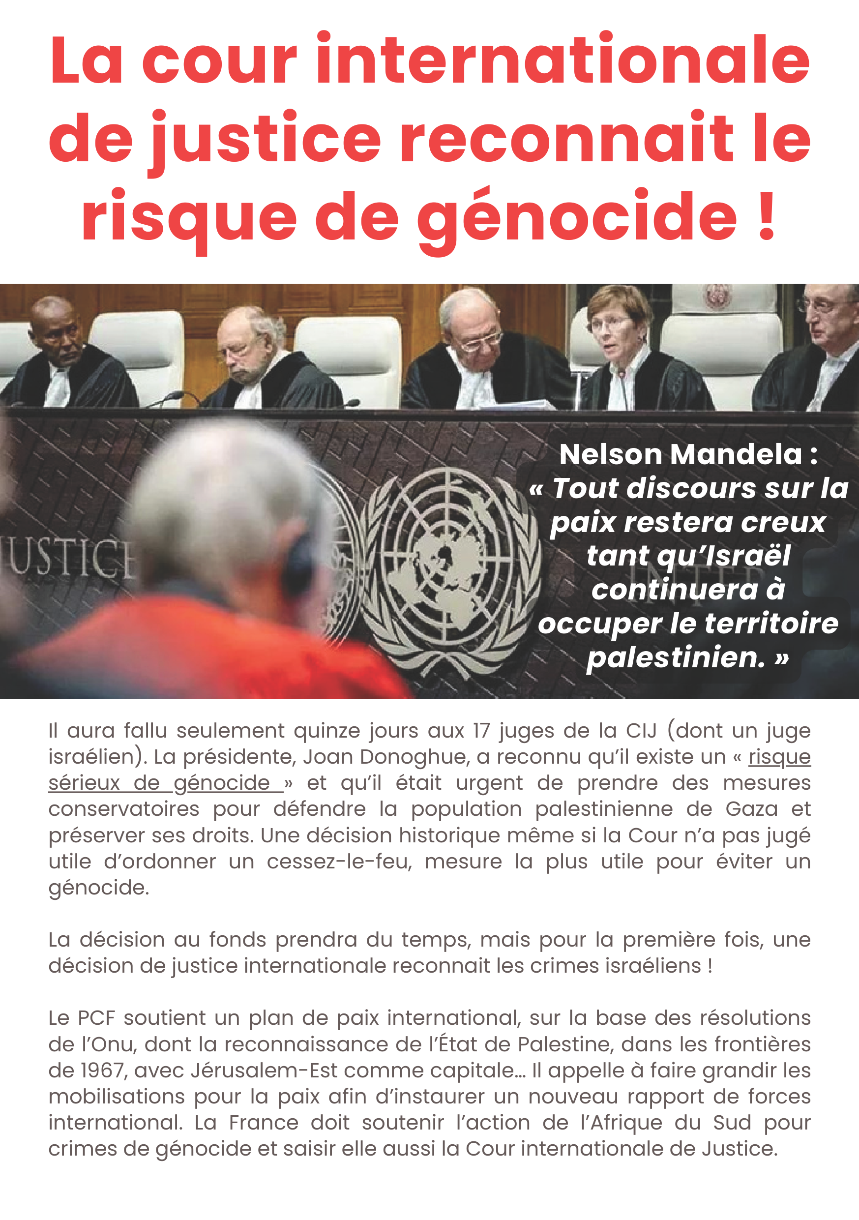 Le PCF soutient un plan de paix international, sur la base des résolutions de l’Onu, dont la reconnaissance de l’État de Palestine, dans les frontières de 1967, avec Jérusalem-Est comme capitale… Il appelle à faire grandir les mobilisations pour la paix afin d’instaurer un nouveau rapport de forces international. La France doit soutenir l’action de l’Afrique du Sud pour crimes de génocide et la rejoindre à la Cour internationale de Justice.