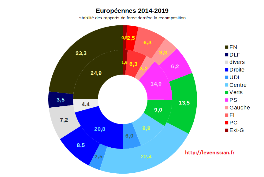 au centre, le premier cercle représente les résultats 2014, à l’extérieur les résultats 2019
