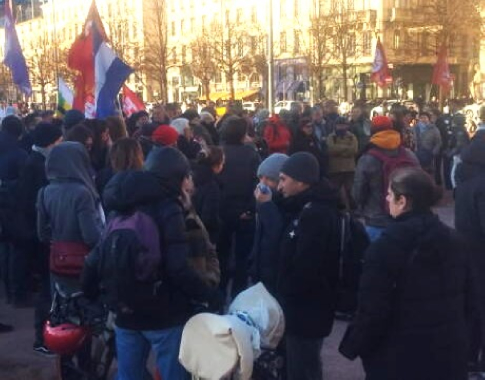 Le premier rassemblement du samedi 3 janvier. prise de parole de Aline Guittard, élue communiste lyonnaise au nom des communistes du Rhône.