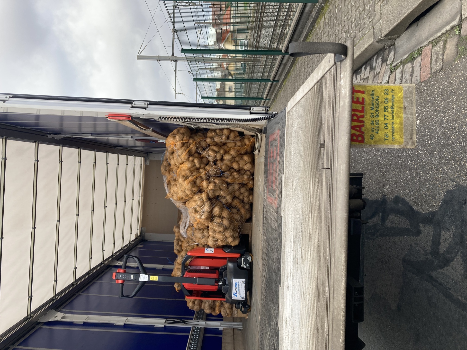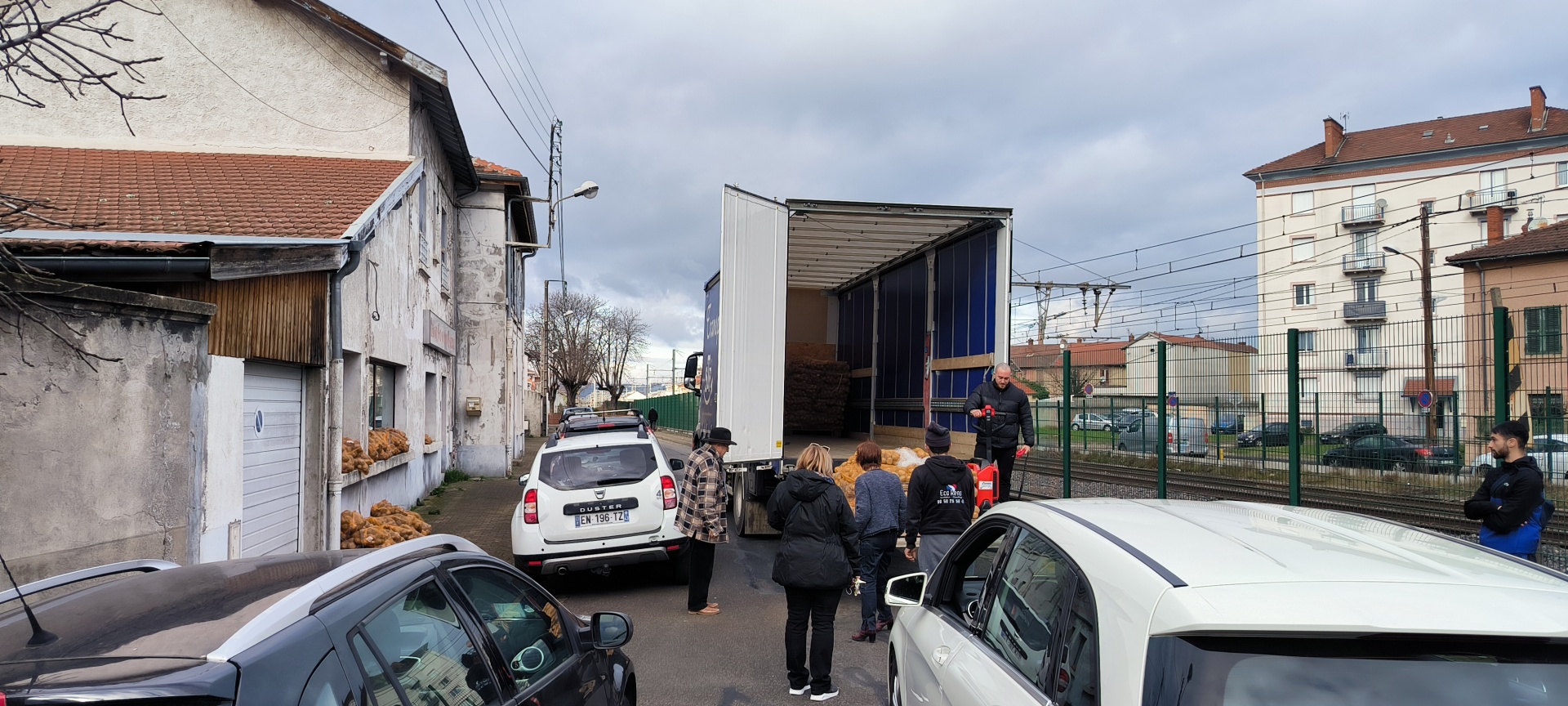 On prévient bien les voitures que la rue est bloquée le temps de décharger deux palettes. Malheureusement, une des deux s’est couchée dans le camion, il faut la décharger sac par sac… ca prend 15 minustes… Heureusement, on est à Vénissieux, la première voiture vient nous donner un coût de main et voulait justement acheter un sac, deux autres jeunes dans un véhicule de travail vienne aider…