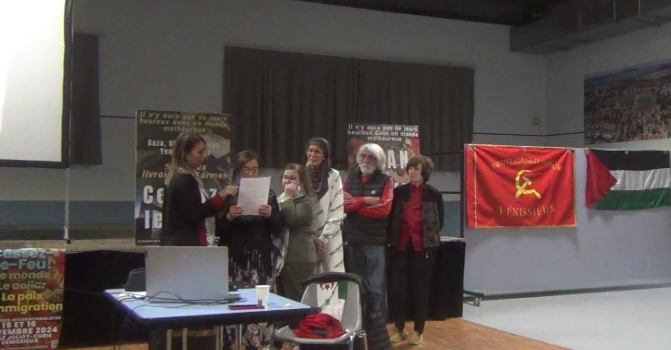 Première soirée des rencontres internationalistes de Vénissieux, intitulée "Cessez-le feu : solidarité avec les peuples palestiniens et libanais !" avec les interventions de Salah Hamouri (en visio), Wafa et Jihad Raad, du parti communiste libanais, Amjad Riat, responsable du centre culturel de Aska, en Cisjordanie occupée, organisateur du récent voyage des jeunes danseurs en France [1] (en visio), Najet Abu Gutna, responsable du centre des femmes de Jénine (en vidéo), Afsia M’hamedi de l’association Jénine-Vénissieux..