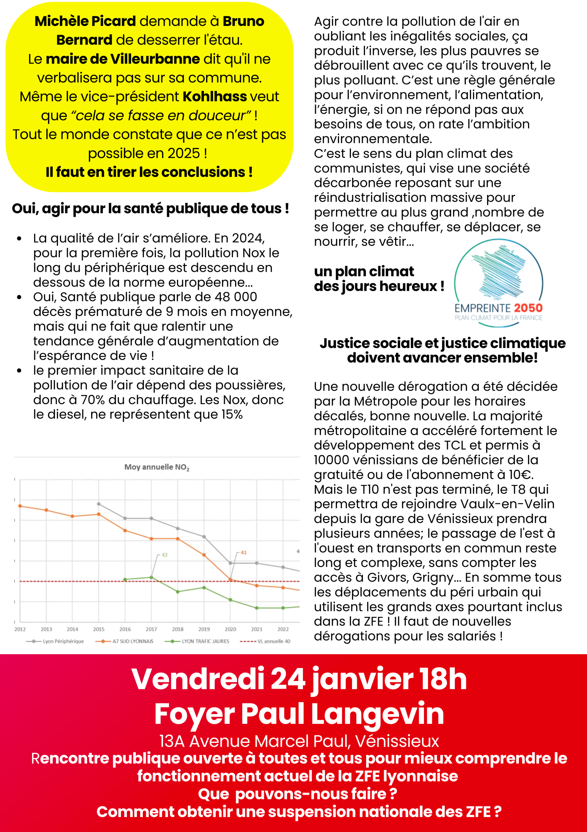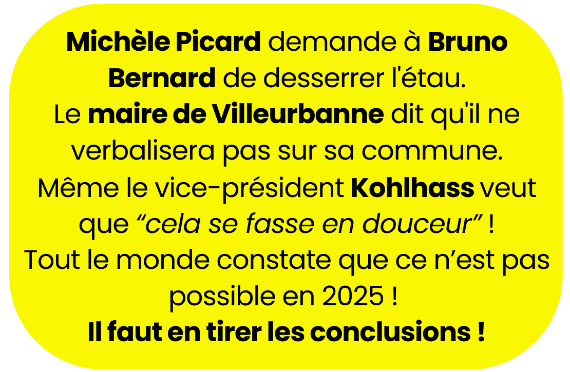 Mais le T10 n’est pas terminé, le T8 qui permettra de rejoindre Vaulx-en-Velin depuis la gare de Vénissieux prendra plusieurs années ; le passage de l’est à l’ouest en transports en commun reste long et complexe, sans compter les accès à Givors, Grigny… En somme tous les déplacements du péri urbain qui utilisent les grands axes pourtant inclus dans la ZFE ! Il faut de nouvelles dérogations pour les salariés !