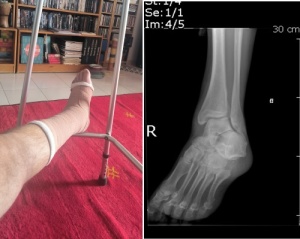 Radio, médecin, le diagnostic est rapide, fracture de la malléole du tibia et déboîtement… il faut plâtrer et il y aura de la kiné… Le programme se met en place, arthroscanner et suivi prévu, et donc béquilles fournies par l’hôpital, et fauteuil prêté par un voisin (merci arnaud !)