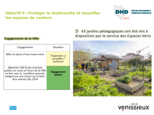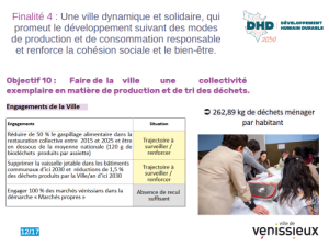 La troisième finalité concerne une ville saine et épanouissante pour les vénissians. Vous avez ici une photo d’action de sensibilisation. 20% des agents ont participé à une animation sur les sujets du DHD, 442 agents, c’est vraiment très significatif, il faut remercier encore une fois toute l’équipe et les référents qui organisent ces actions, et puis auprès du grand public aussi, avec 245 personnes. Ce qui n’est pas négligeable, même si là on pourrait se dire qu’il faut arriver à faire plus. et c’est tout l’enjeu du travail partenarial avec les conseils de quartier.