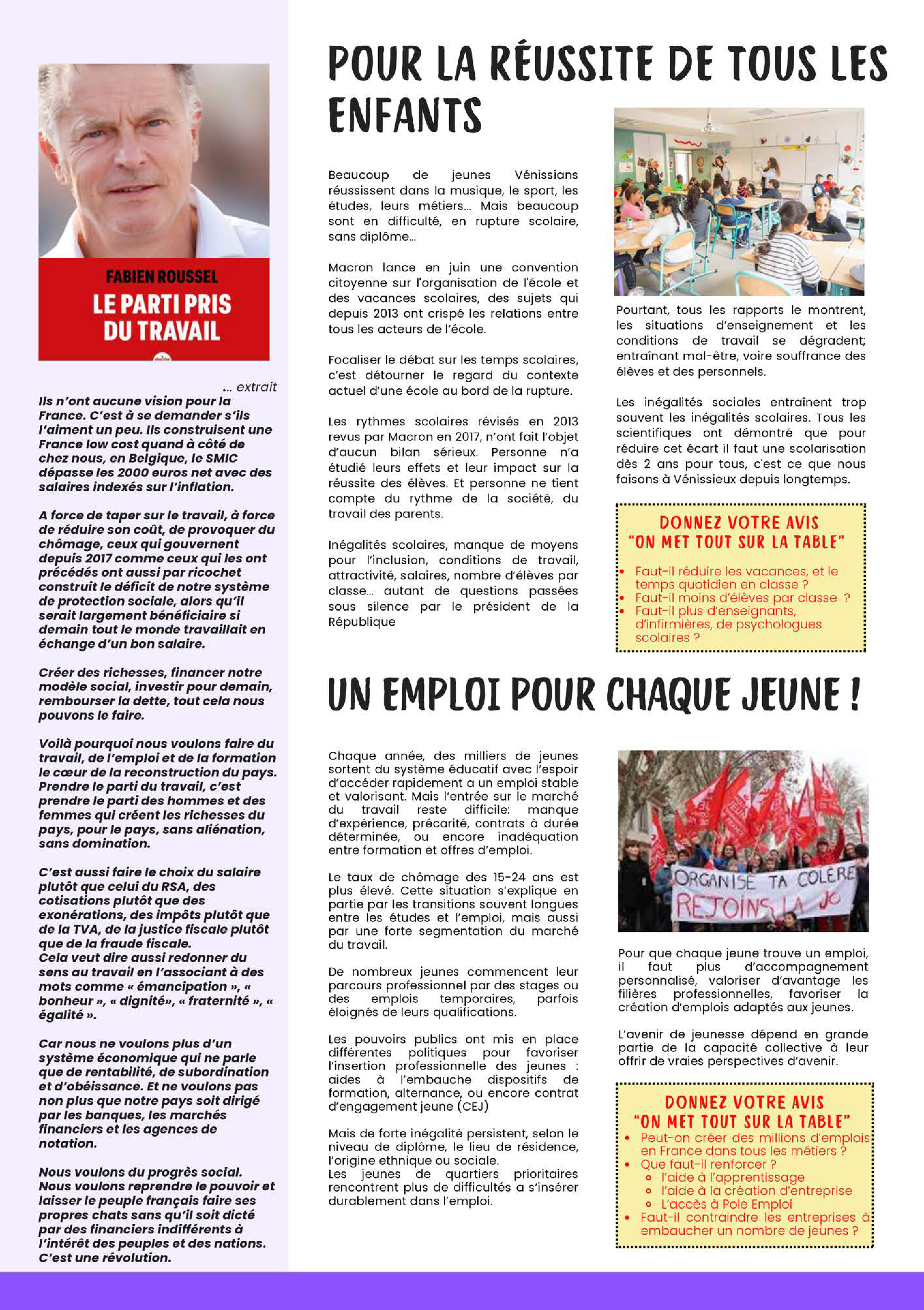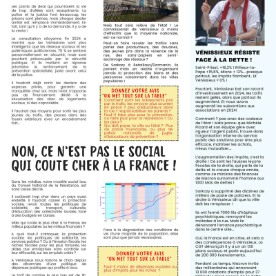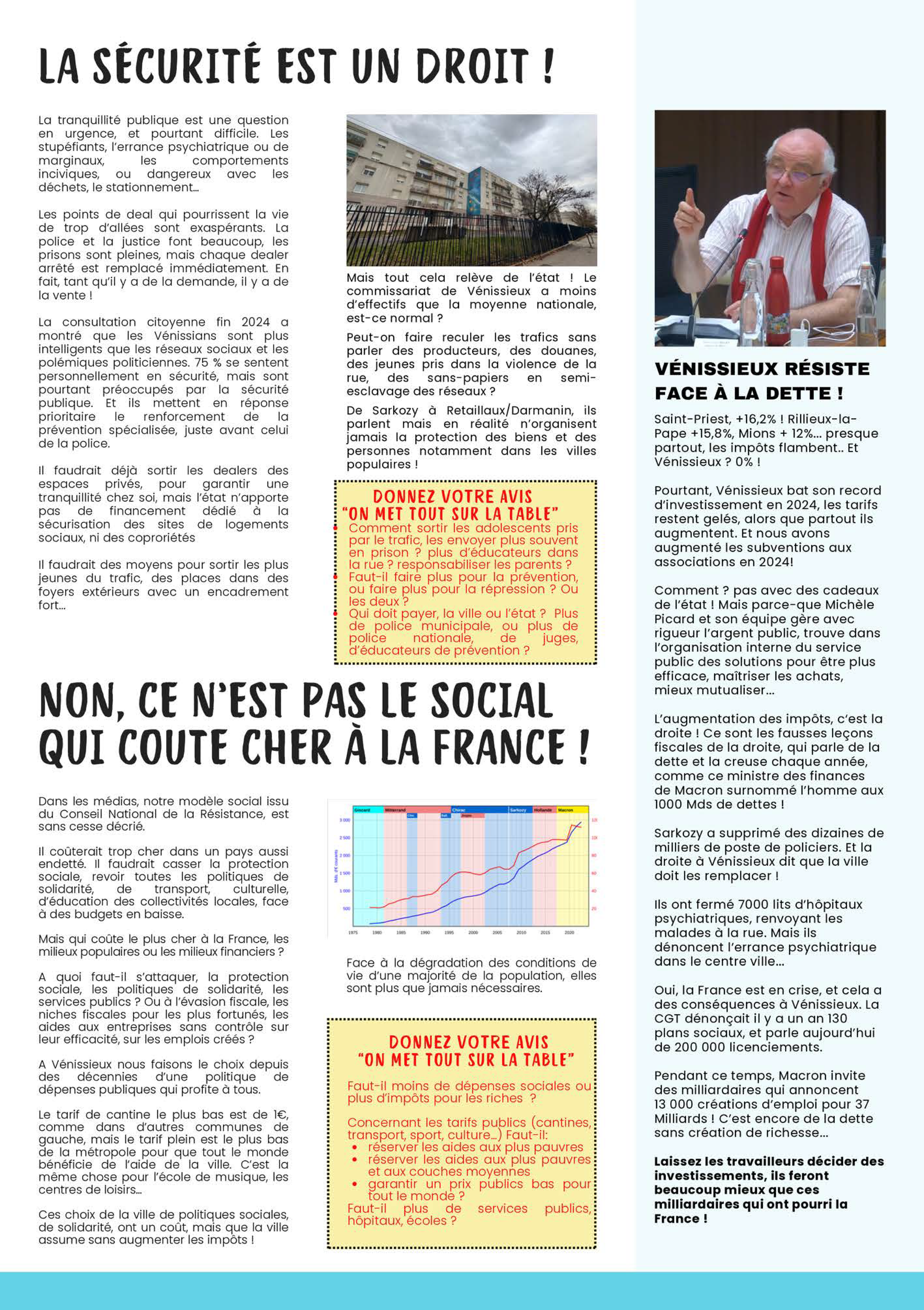 Est-ce qu’on fait trop de social à Vénissieux, ou pas assez, ou peut-être faut-il faire autrement ? Est-ce qu’on fait trop ou pas assez pour l’école ? le périscolaire, la culture, le sport, la vie associative ? Que faire de mieux ou de plus pour l’insertion, la formation, l’emploi ? Faut-il accepter de payer à la place de l’état pour la sécurité ?