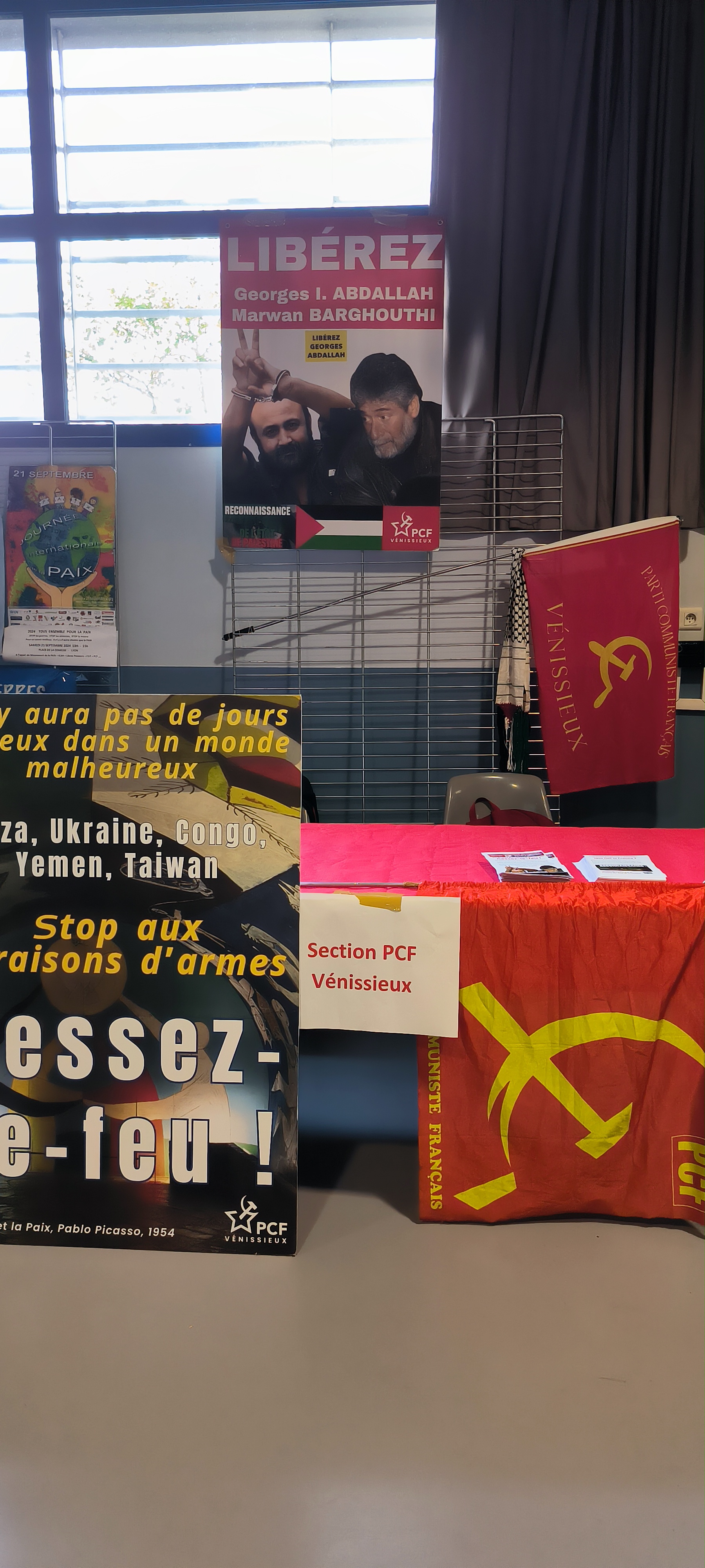 Les communistes nombreux avaient un stand avec leurs panneaux de manifestations pour le cessez-le-feu, la reconnaissance de l’état de Palestine et la libération de Marwan Barghouti et Georges Abdallah, avec un nouveau tract (ci-dessous), dénonçant la guerre totale choisie par le régime d’extrême-droite au pouvoir en Israël, qui n’est possible que par la stratégie des USA au moyen-orient qui ne répond aux intérêts d’aucun peuple, ni aux juifs, ni bien sûr aux palestiniens, qui ne répond qu’à la tentative de plus en plus désespérée d’imposer coûte que coûte la domination US sur l’économie mondiale et notamment sur une région clé pour les pétro-dolars.