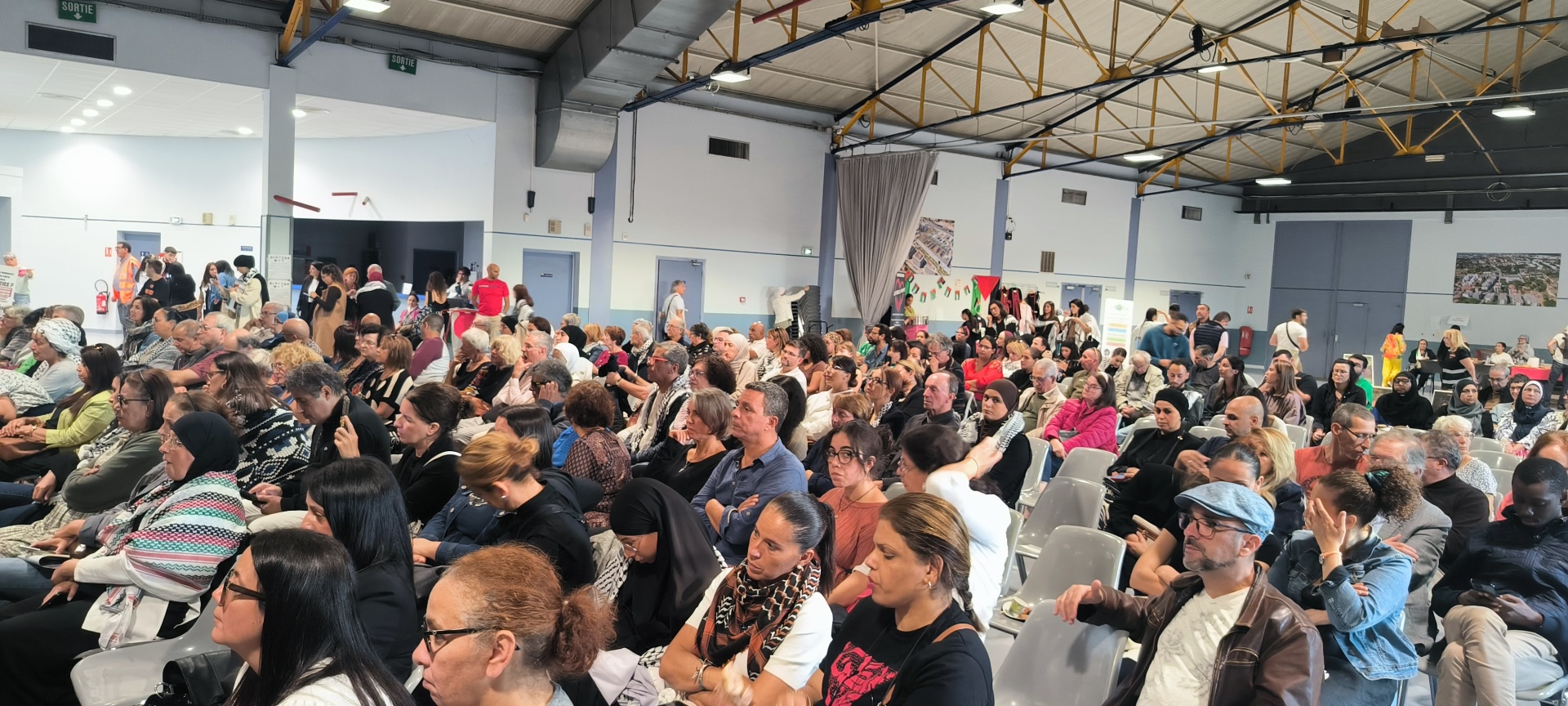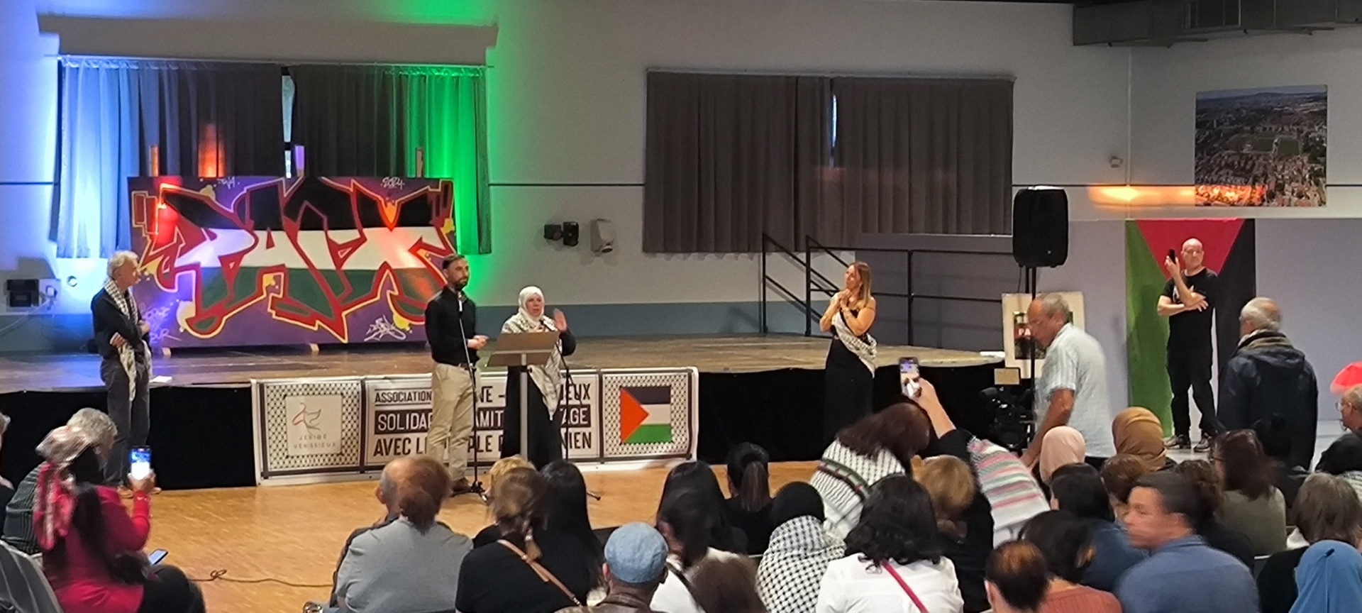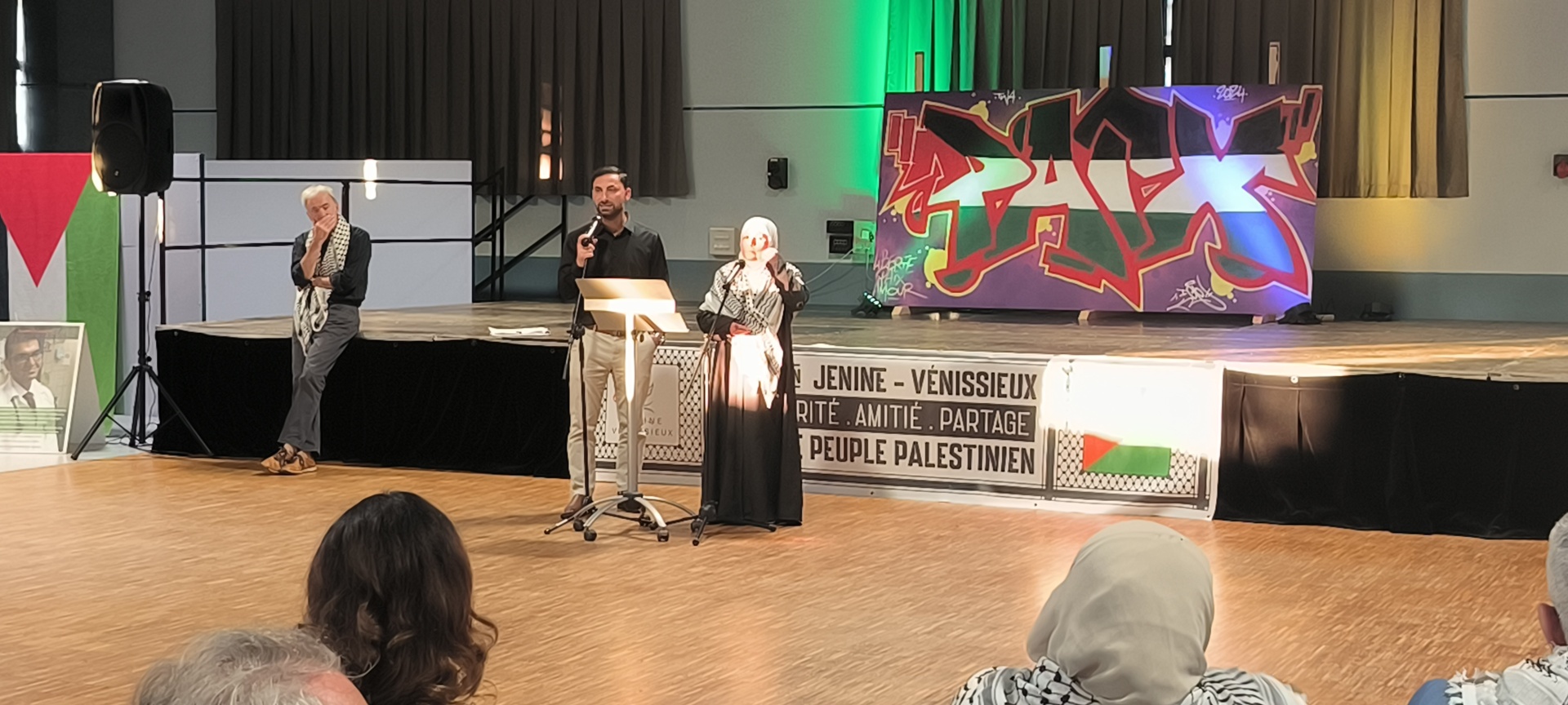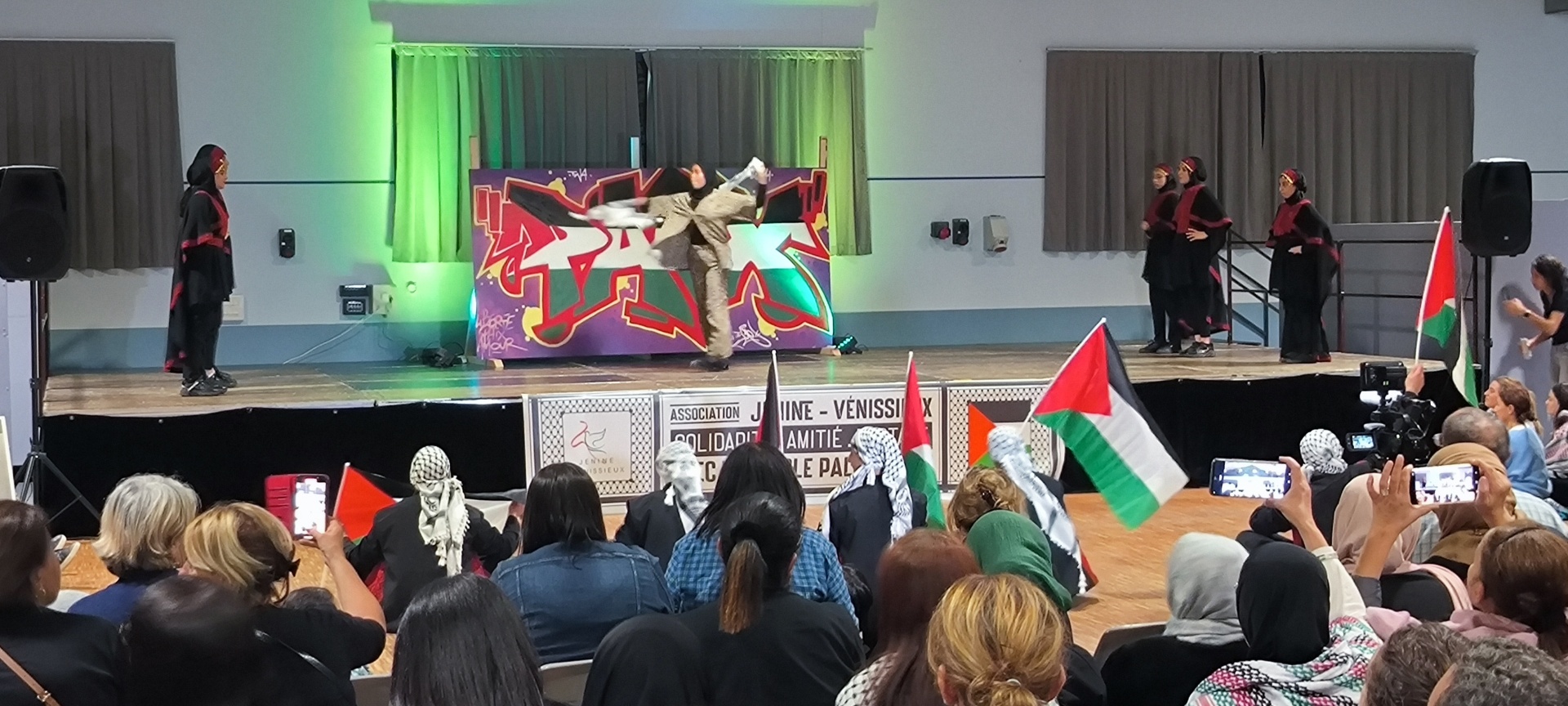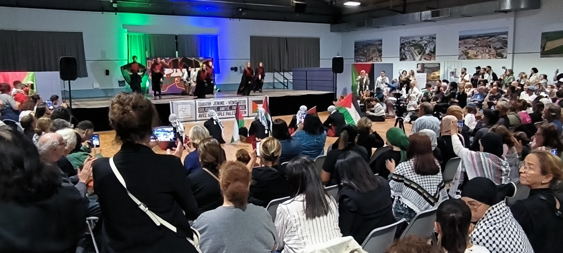 Encore un grand succès pour la Palestine a Vénissieux, plus de 600 personnes à l’inviation de l’association Jénine-Vénissieux et du collectif Palestine 69, avec avec les jeunes danseurs du camp d’Aksar, le témoignage bouleversant de madame Shakura, dont le fils travaille à Vénissieux et a pu la faire sortir de Gaza il y a 4 mois, mais qui dira avec émotion que son âme y reste avec ses enfants et ses proches dans les décombres.