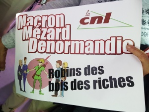 Résultat, la salle est chauffée pour l’accueil du ministre qui monte sur scène sous les huées et peine à faire son discours interrompu à de multiples reprises par les slogans, notamment de la CNL ’HLM pour tous’, « pas touche à l’argent des locataires », ou encore l’excellent « Macron Robin des bois des riches »…