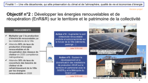 Le deuxième objectif porte sur le développement des énergies renouvelables et de récupération (EnR&R) sur le territoire et le patrimoine de la collectivité. Cela se traduit par trois engagements fort, le triplement de la production d’électricité renouvelable, que nous continuons à développer en autoconsommation, ce qui ne nous permet pas d’atteindre les objectifs de la labellisation, mais qui correspond à une décision très politique, ne pas favoriser la marchandisation de l’électricité. A ce propos, permettez-moi de rappeler que si l’électricité augmente en ce début d’année, ce n’est pas parce-que les coûts de production ou de distribution augmente, mais parce-que la taxe TICFE n’est plus annulée par le bouclier tarifaire. Cette taxe sert en premier lieu à financer le rachat obligatoire d’électricité renouvelable par EDF. C’est à dire que nous payons tous les heureux installateurs d’électricité renouvelable non auto-consommée et revendue au réseau électrique.