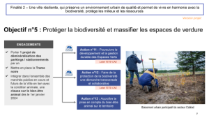 L’objectif 5 protège la biodiversité et massifie les espaces de verdure, un sujet comme l’énergie sur lequel la ville travaille depuis longtemps, je rappelle que les espaces verts sont devenus zero-phyto dès les années 90, il y a 30 ans ! Mais nous continuerons à innover en réalisant un projet de déminéralisation de parking par an, en travaillant pour mettre en place une trame noire, qui permet la nuit d’éviter l’éclairage pour permettre à la faune nocturne de se déplacer, et en intégrant une clause sur la condition animale dans tous nos marchés concernés.