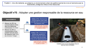 L’objectif 6 concerne la ressource en eau, un sujet vital, depuis toujours, mais encore plus depuis qu’on prend conscience qu’il est possible de se retrouver sans eau, que le village de Gualba, en Andalousie, un nom qui veut dire « eau vive » se retrouve sans eau, ses habitants réduits à la seule eau en bouteille. Entre sécheresse et inondations, ce n’est pas l’eau qui est rare, mais notre gestion de l’eau qui n’est trop souvent pas responsable, et c’est bien au contraire, ce que nous cherchons avec cet objectif d’une gestion responsable de la ressource, avec l’engagement de baisser de 25% nos consommations dans les bâtiments, comme dans les espaces verts, où nous développons dorénavant le stockage, comme sur cette photo aux serres municipales, mais nous en prévoyons aussi dans la ZAC Monmousseau Balmes. Je suis convaincu que les puissances publiques doivent investir plus pour garantir la capacité à défendre notre végétalisation malgré les sécheresses.