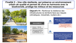 Dans la finalité deux, une ville résiliente qui préserve l’environnement, le premier objectif est justement de renforcer la résilience face aux risques, bien sûr climatiques, mais aussi industriels ou routiers. C’est tout l’enjeu de la végétalisation avec deux engagements qui mettent en valeur ce que nous faisons déjà, un ilot de fraicheur par an et deux végétalisations de cour d’école, et une action indispensable sur la sécurité dans les déplacements.