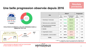 Tout d’abord, situons cette stratégie dans l’histoire de la labellisation vénissiane. Engagé en 2016, nous avions à l’époque un score de 54,5% qui est passé en 2019 à 61,1%. Ce pourcentage veut dire que nous réalisions en 2019 61,1% de tout ce qui peut être fait dans les meilleurs pratiques de collectivités, selon le référentiel européen porté par l’ADEME en France, référentiel qui pourtant évolue lui-même à chaque édition. Le travail engagé nous laisse espérer une prochaine évaluation s’approchant de 69%, même s’il faut attendre évidemment l’auditeur officiel et la commission du label pour connaitre le résultat final. Cela nous place dans le peloton de tête des communes en France et devrait nous permettre d’obtenir la 4e étoile du label. Avec le plan d’actions qui s’ajoute, on serait à 72,5%, donc permettez-moi un sourire, il restera encore un effort à faire pour attacher la 5e étoile. Ce n’est qu’un sourire, car le vrai intérêt de cette labellisation, ce ne sont pas les étoiles, ni la remise officielle des diplômes, mais bien tout le travail réalisé par les services pour évaluer, justifier, démontrer à l’auditeur la réalité des résultats, un travail qui nous aide d’abord à maitriser nos engagements et à rendre plus efficaces nos actions.