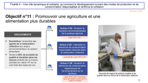 L’objectif nr 11 est en plein dans l’actualité récente, avec les blocages d’agriculteurs comme avec la vente de pommes de terre solidaire. Nous prenons l’engagement de sensibiliser tous les agents de la restauration aux enjeux environnementaux de l’alimentation, et d’aller vers la moitié de produits de qualité et durable de la cuisine centrale.