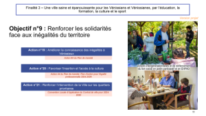 Avec la finalité trois, le développement humain durable prend tout son sens. On sait que les objectifs de l’ONU donne une grande place à cette dimension humaine et sociale, mais c’est pour nous à Vénissieux essentiel, et l’objectif n9 vise à renforcer les solidarités face aux inégalités du territoire. Difficile de définit des engagements tant les inégalités sont d’abord le fait de la société dans son ensemble, donc de la politique nationale, mais nous voulons renforcer nos actions pour l’accès à l ’insertion, à la culture, et notamment dans les quartiers prioritaires.