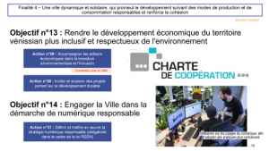 L’objectif 13 doit rendre le développement économique du territoire vénissian plus inclusif et respectueux de l’environnement, avec notamment la charte de coopération avec les entreprises. Ceux qui avaient participé au conseil citoyen DHD avec les entreprises avaient été surpris de la richesse des actions conduites par les entreprises, et sans doute c’est une des clés pour que notre stratégie se déploie sur tout le territoire. Elle doit être animée avec les entreprises.