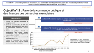 Le douzième objectif vise à une ville exemplaire dans ses achats. Nous faisons déja beaucoup, mais on peut faire plus et aussi d’ailleurs, mieux le faire savoir. Nous avons plus de 50 marchés avec une clause sociale ou environnementale en 2023 et le dossier le plus compliqué sera de réaliser une évaluation climatique du budget de la ville, ce que certains appellent un budget vert