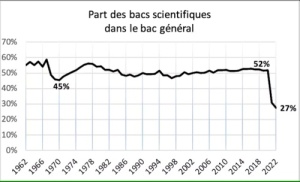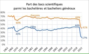 Et cette chute est encore plus forte pour les filles, qui étaient 44% à réussir un BAC scientifique en 2018 et ne sont plus que… 17% en 2022 ! Elles sont même moins nombreuses en proportion à préparer un BAC scientifique qu’en … 1962 !