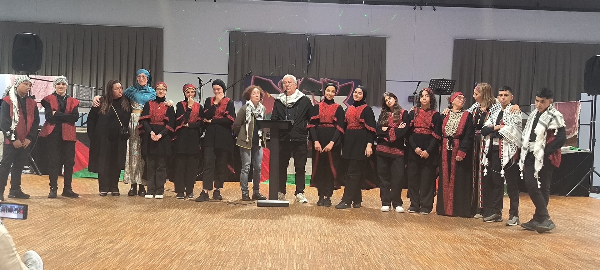 L’après-midi s’est poursuivie avec une initiation à la danse Dabke, assurée par Doaa, professeure et chorégraphe du centre communautaire du camp de New Askar. Plus d’une trentaine de personnes ont découvert avec enthousiasme cette danse festive et fière, emblématique de l’identité palestinienne. La pause littéraire « Palestea Time », animée par Arlette Cavillon (Mouvement de la Paix) et Ambrine, coordinatrice du Collectif des Amis d’Askar, a permis la lecture et l’écoute de textes d’auteures palestiniennes, mettant en lumière la force poétique et la profondeur du patrimoine littéraire palestinien. Après la diffusion d’un court métrage de Roland Nurier consacré à la troupe de jeunes danseurs Dabke de Gaza, qui l’avait accompagné lors du tournage de Yallah Gaza, une conférence a suivi, éclairant les enjeux de la culture comme résistance. Il a rappelé que l’effacement ou l’appropriation du patrimoine constitue l’un des visages du système colonial. Préserver, transmettre et faire vivre culture et mémoire est donc un acte politique, au cœur de la continuité d’un peuple.