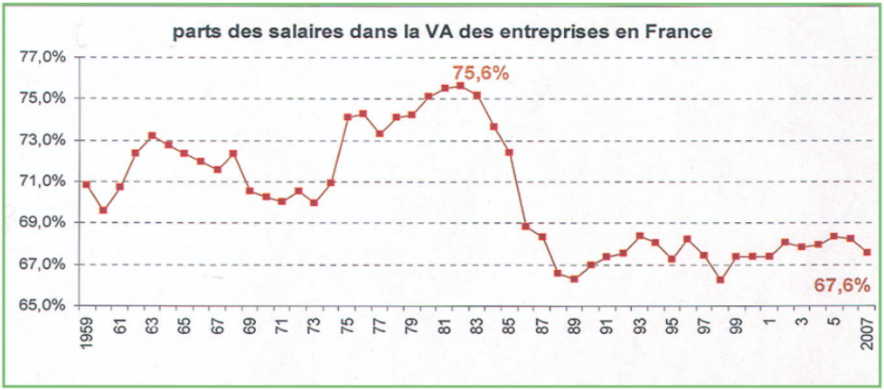 Or de 1982 à 2007, la part des salaires dans les richesses produites a perdu 8 points, environ 120 à 180 Mds d’euros par an. L’enjeu essentiel de la lutte des classes se situe entre la part des salaires et celle des profits. C’est celui de la bataille pour les retraites.