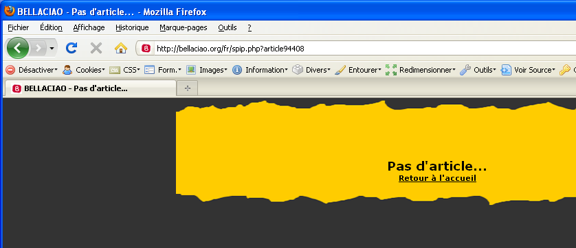 pour ceux qui ne connaissent pas bien, notez le numéro de l’article dans la barre de titre de la page internet, c’est le numéro 94408 et l’adresse http://bellaciao.org/fr/spip.php?article94408 qui existait et a même été indexé par google, cette adresse a été supprimé par la censure…